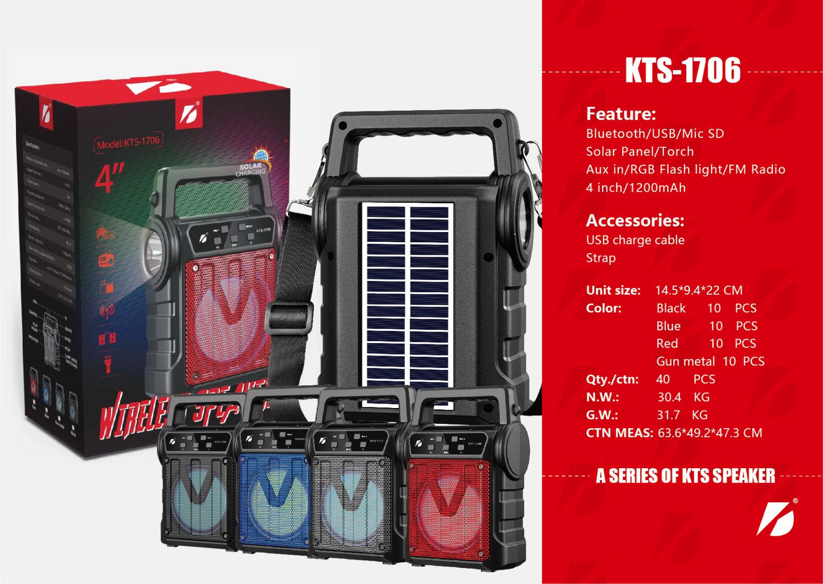 KTS-1706 Portable Bluetooth Speaker | 4-Inch Subwoofer | RGB Light | FM Radio | Solar Panel | USB, AUX, TF & Mic Support